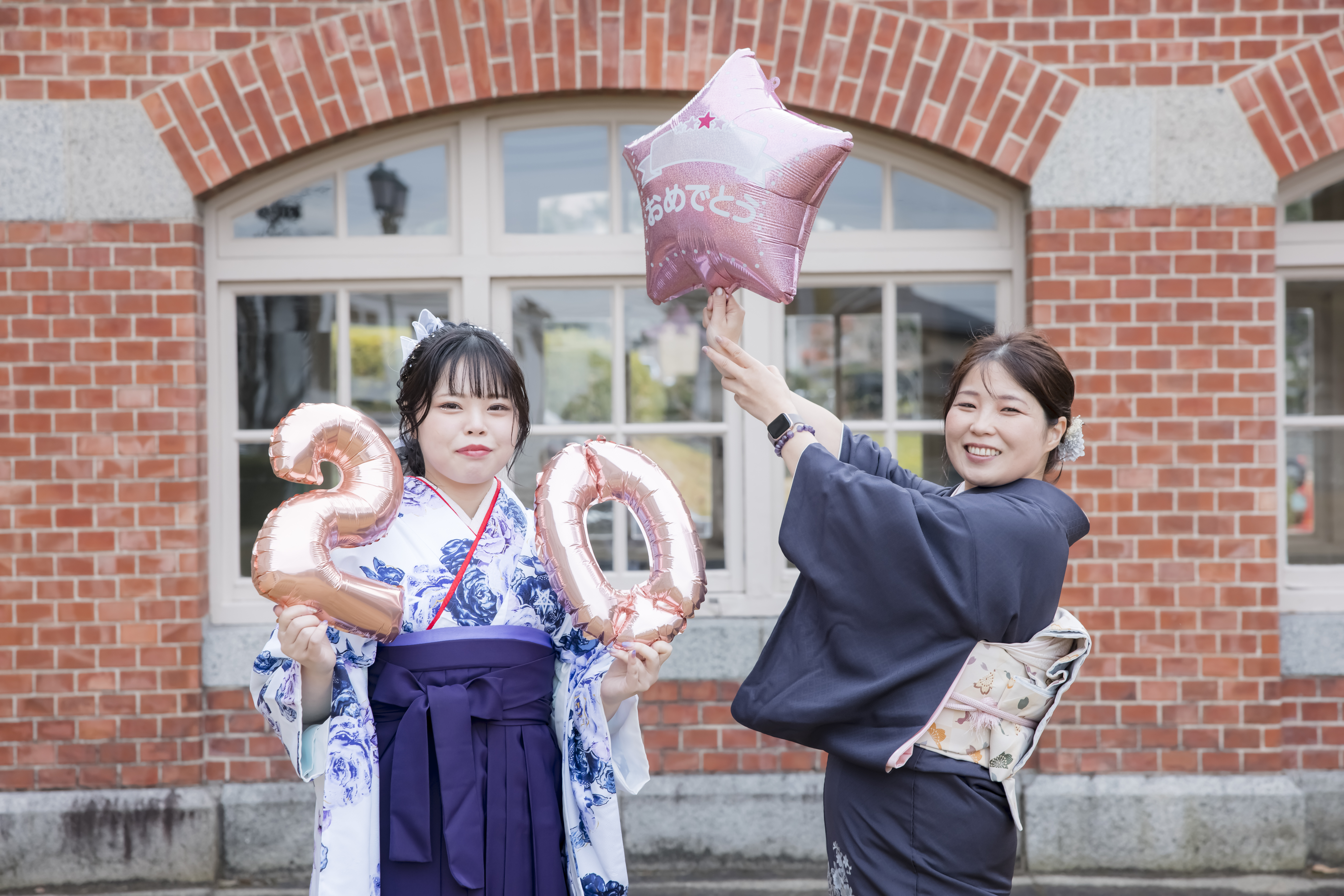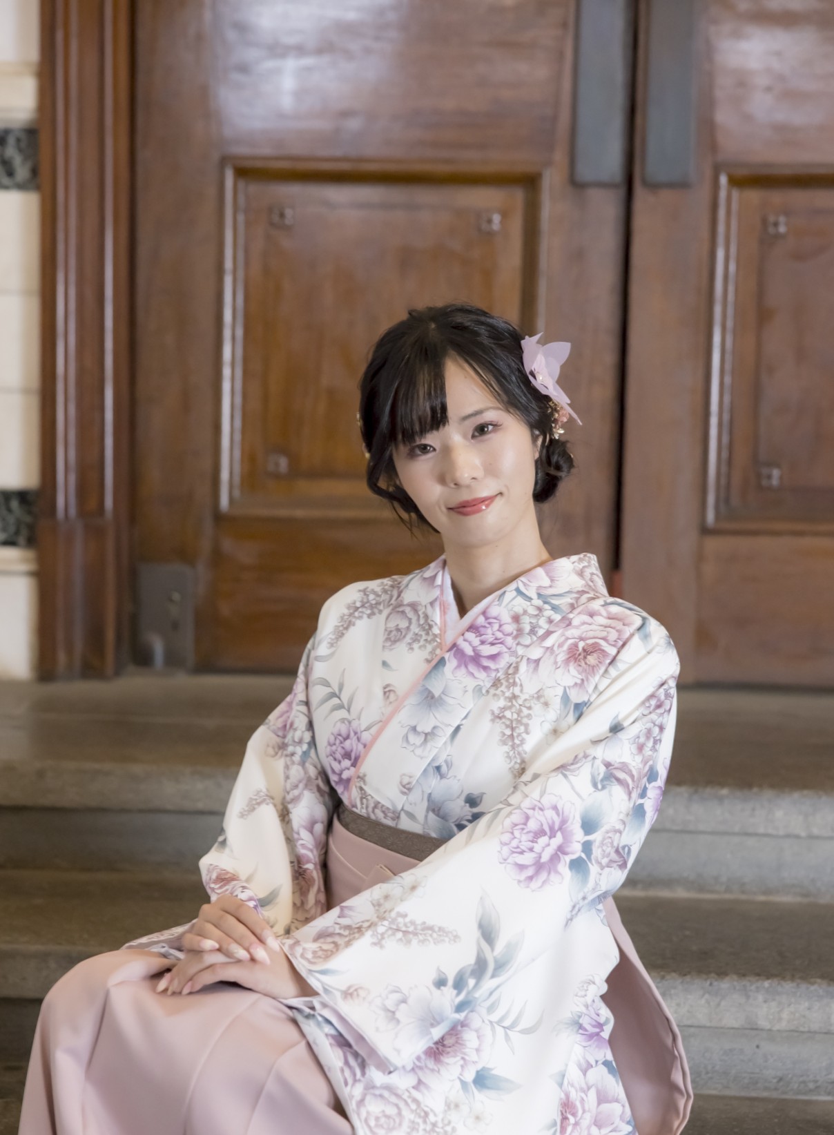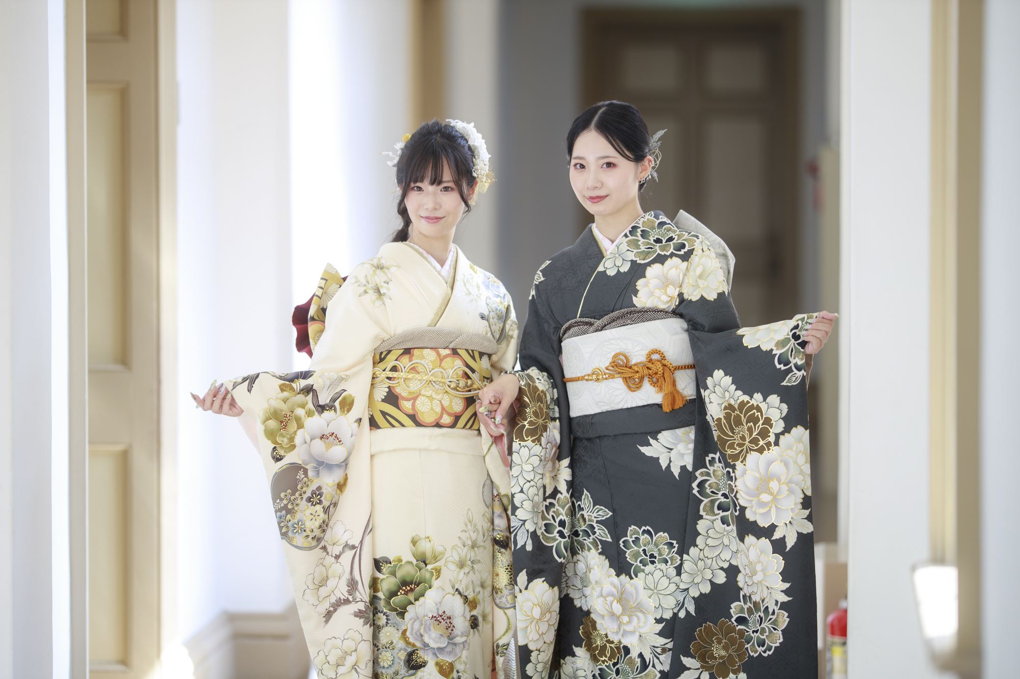 A. はい、成人式で着用された振袖(中振袖)を卒業式の袴に合わせるのは、とても華やかで素敵な選択です。思い出の振袖を再び着ることで、費用を抑えられるというメリットもあります。一般的には、袴には袖の短い「二尺袖(小振袖)」という着物を合わせることが多いですが、決まりはありません。振袖を合わせる際は、長い袖が地面につかないよう、階段の上り下りや椅子に座る際の所作に少し気をつける必要があります。